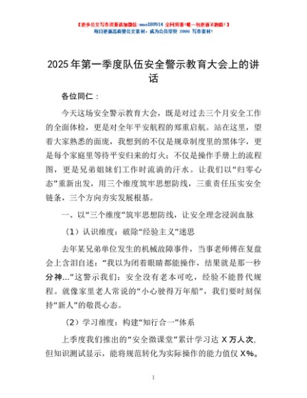 / 2025年第一季度队伍安全警示教育大会上的讲话