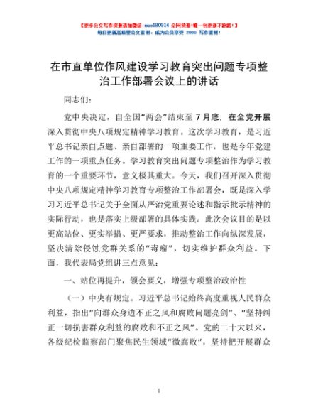 / 在市直单位作风建设学习教育突出问题专项整治工作部署会议上的讲话