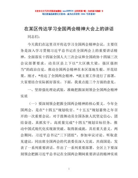 / 在某区传达学习全国两会精神大会上的讲话