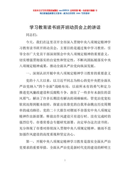 / 学习教育读书班开班动员会上的讲话