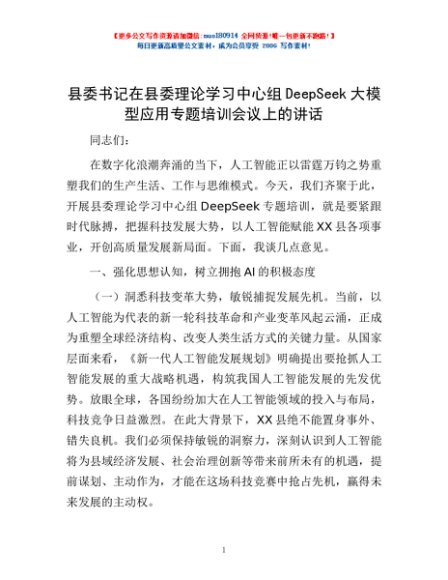/ 县委书记在县委理论学习中心组DeepSeek大模型应用专题培训会议上的讲话