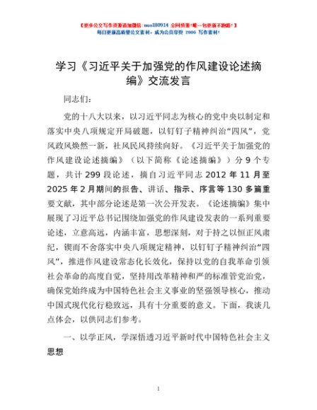 / 学习《习近平关于加强党的作风建设论述摘编》交流发言