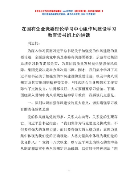 / 在国有企业党委理论学习中心组作风建设学习教育读书班上的讲话