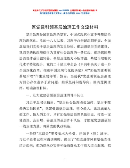 / 区党建引领基层治理工作交流材料