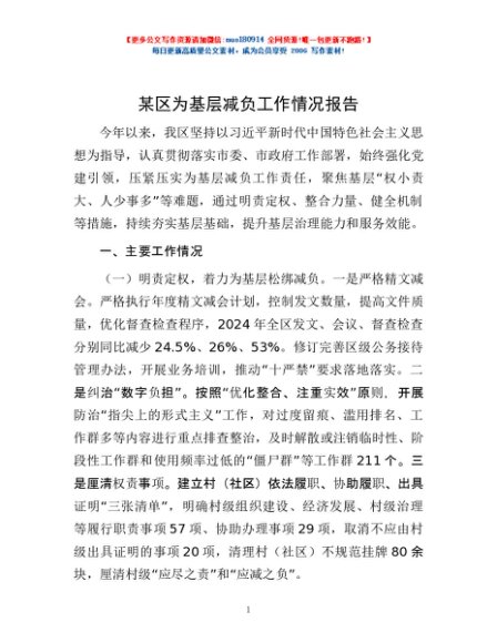 / 某区为基层减负工作情况报告
