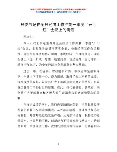 / 县委书记在全县经济工作冲刺一季度“开门红”会议上的讲话