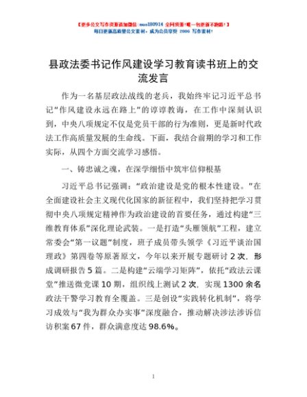 / 县政法委书记作风建设学习教育读书班上的交流发言