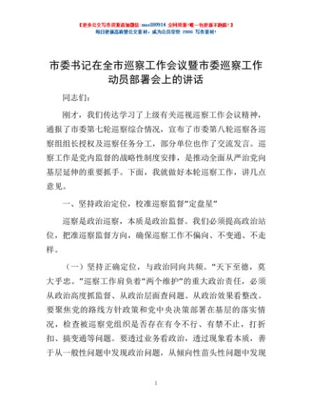 / 市委书记在全市巡察工作会议暨市委巡察工作动员部署会上的讲话