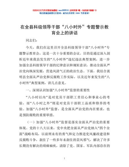 / 在全县科级领导干部“八小时外”专题警示教育会上的讲话