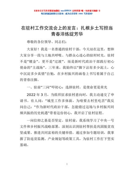 / 在驻村工作交流会上的发言:扎根乡土写担当青春淬炼绽芳华
