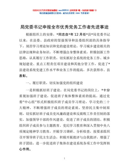 局党委书记申报全市优秀党务工作者先进事迹