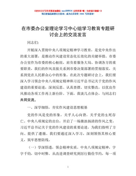 / 在市委办公室理论学习中心组学习教育专题研讨会上的交流发言