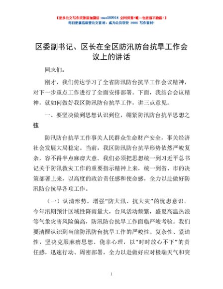 / 区委副书记、区长在全区防汛防台抗旱工作会议上的讲话