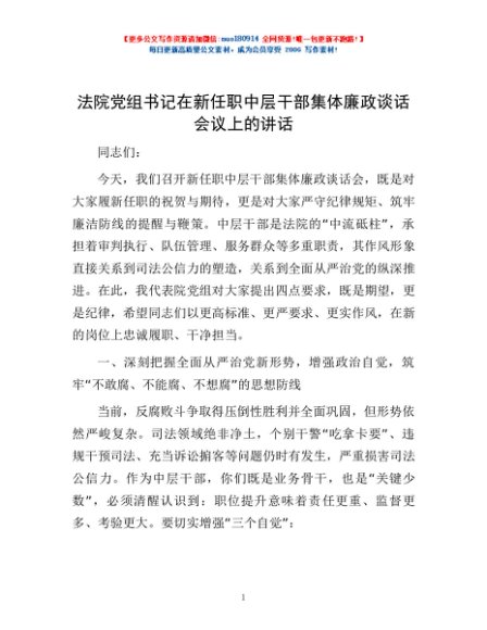 / 法院党组书记在新任职中层干部集体廉政谈话会议上的讲话