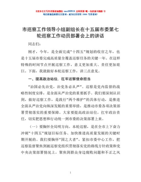 / 市巡察工作领导小组副组长在十五届市委第七轮巡察工作动员部署会上的讲话