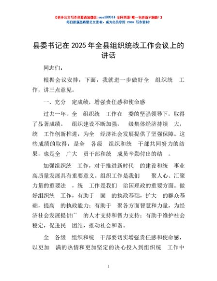 / 县委书记在2025年全县组织统战工作会议上的讲话
