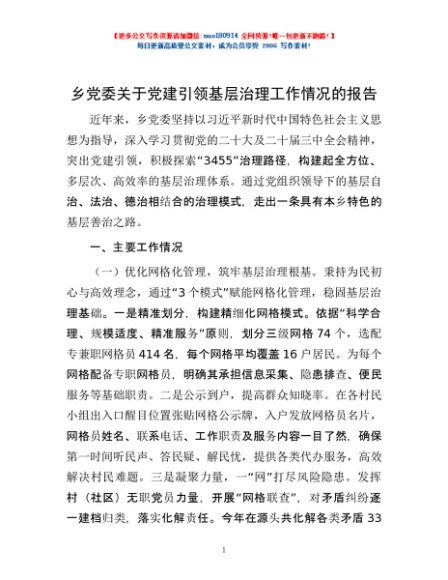 / 乡党委关于党建引领基层治理工作情况的报告