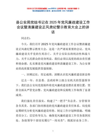 / 县公安局党组书记在2025年党风廉政建设工作会议暨清廉建设正风肃纪警示教育大会上的讲话