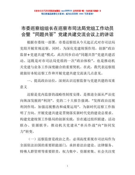 / 市委巡察组组长在巡察市司法局党组工作动员会暨“同题共答”党建共建交流会议上的讲话