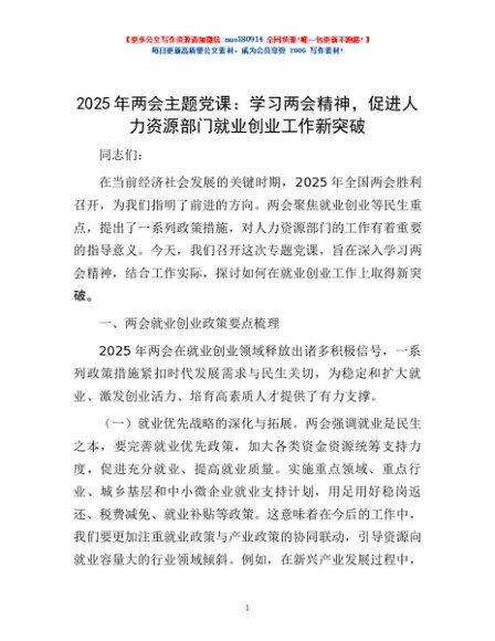 / 2025年两会主题党课:学习两会精神,促进人力资源部门就业创业工作新突破