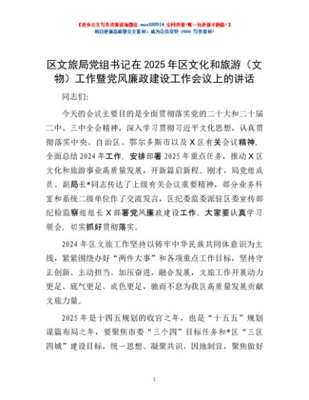 / 区文旅局党组书记在2025年区文化和旅游(文物)工作暨党风廉政建设工作会议上的讲话