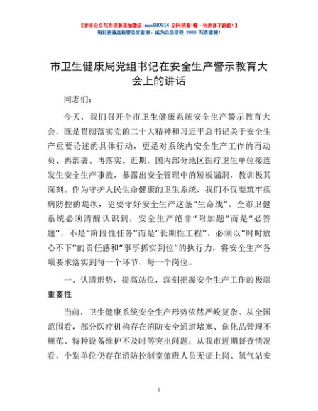 / 市卫生健康局党组书记在安全生产警示教育大会上的讲话