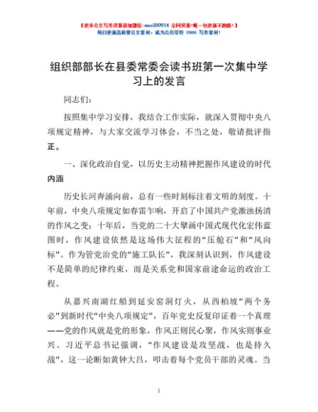 / 组织部部长在县委常委会读书班第一次集中学习上的发言