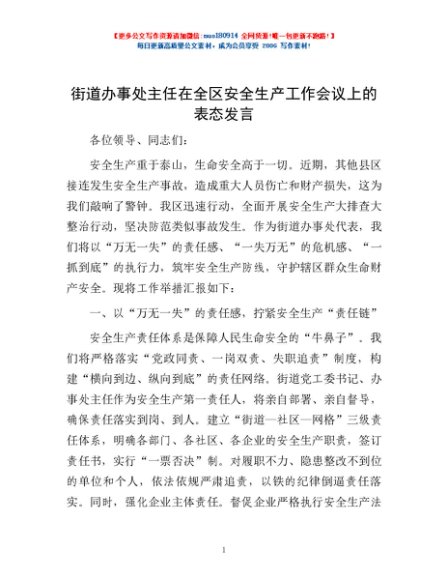 / 街道办事处主任在全区安全生产工作会议上的表态发言
