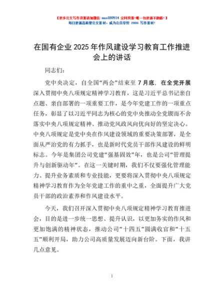 / 在国有企业2025年作风建设学习教育工作推进会上的讲话