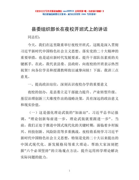 / 县委组织部长在夜校开班式上的讲话
