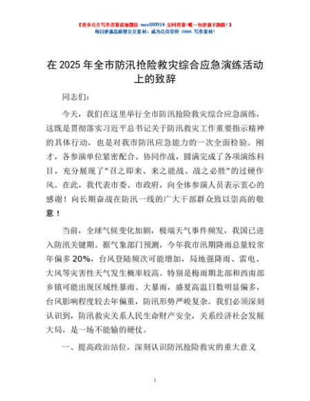 / 在2025年全市防汛抢险救灾综合应急演练活动上的致辞