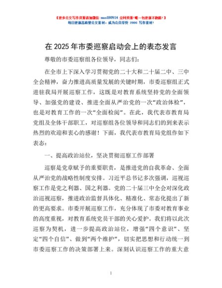 / 在2025年市委巡察启动会上的表态发言
