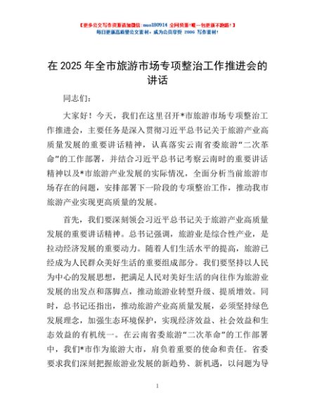 / 在2025年全市旅游市场专项整治工作推进会的讲话