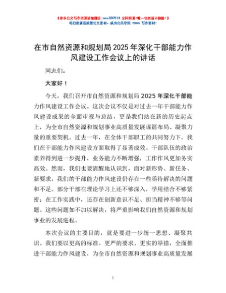 / 在市自然资源和规划局2025年深化干部能力作风建设工作会议上的讲话