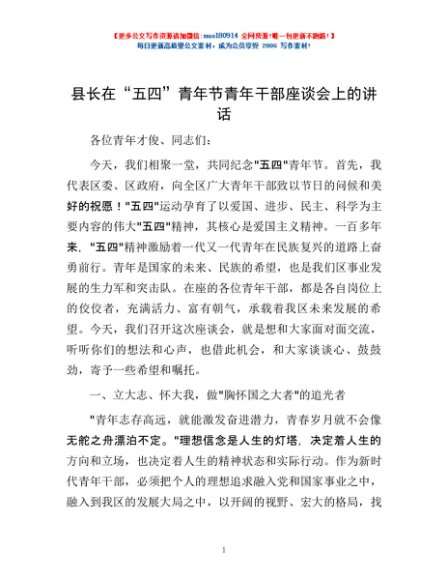 / 县长在“五四”青年节青年干部座谈会上的讲话