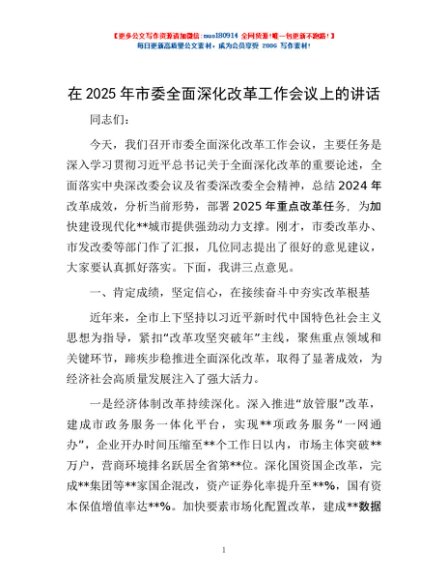 / 在2025年市委全面深化改革工作会议上的讲话