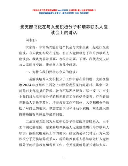 / 党支部书记在与入党积极分子和培养联系人座谈会上的讲话