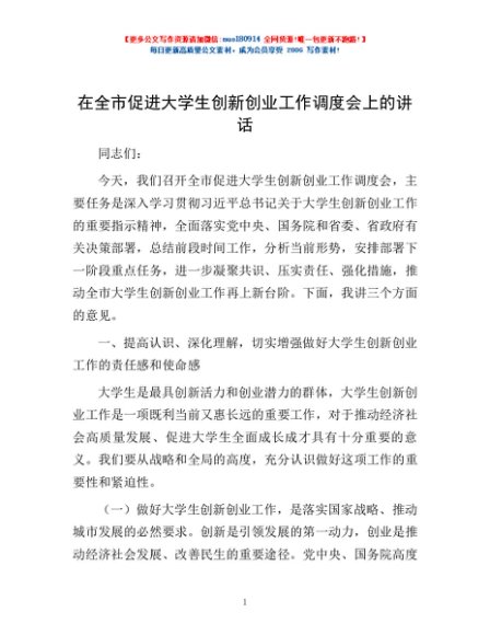/ 在全市促进大学生创新创业工作调度会上的讲话
