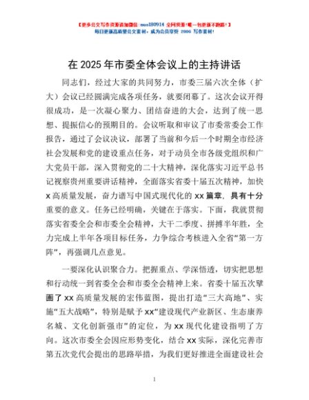 / 在2025年市委全体会议上的主持讲话