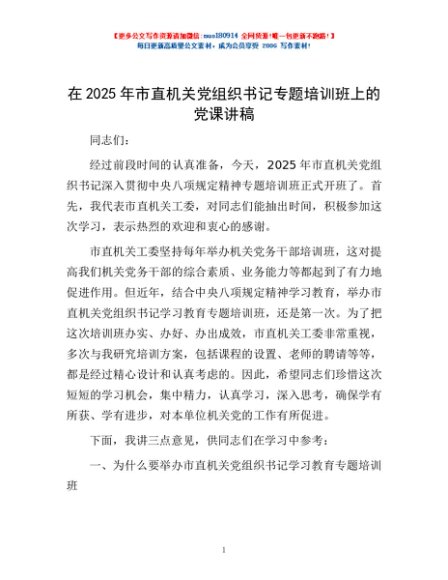 / 在2025年市直机关党组织书记专题培训班上的党课讲稿