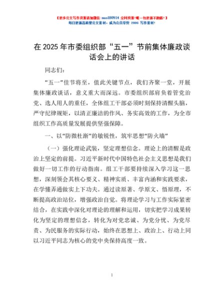 / 在2025年市委组织部“五一”节前集体廉政谈话会上的讲话