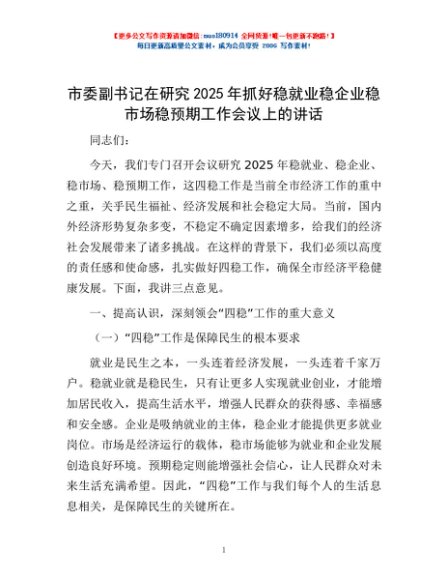 / 市委副书记在研究2025年抓好稳就业稳企业稳市场稳预期工作会议上的讲话