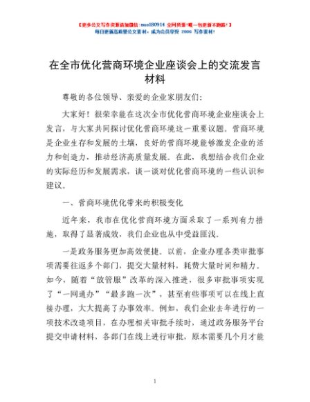 / 在全市优化营商环境企业座谈会上的交流发言材料