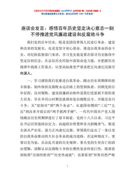 / 座谈会发言:感悟百年历史 坚定决心意志 一刻不停推进党风廉政建设和反腐败斗争