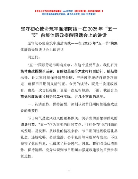 / 坚守初心使命 筑牢廉洁防线--在2025年“五一节”前集体廉政提醒谈话会上的讲话