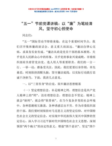 / “五一”节前党课讲稿:以“廉”为笔绘清风,坚守初心担使命