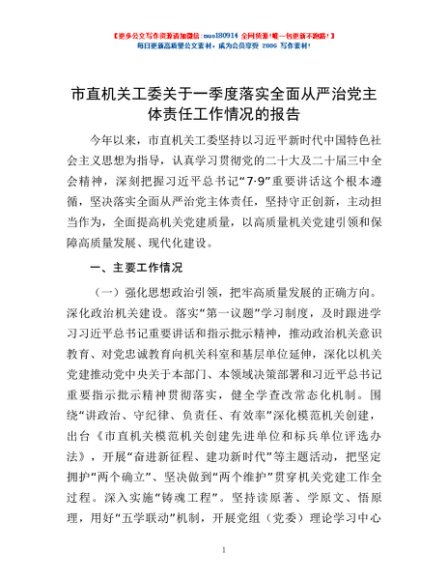 / 市直机关工委关于一季度落实全面从严治党主体责任工作情况的报告