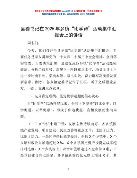/ 县委书记在2025年乡镇“比学帮”活动集中汇报会上的讲话