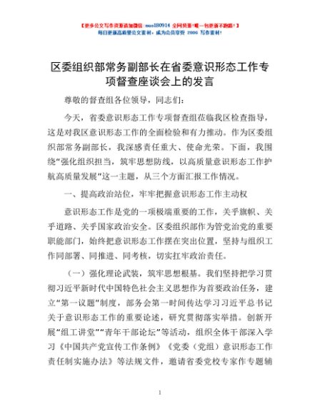 / 区委组织部常务副部长在省委意识形态工作专项督查座谈会上的发言