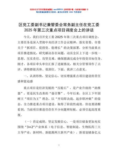 / 区党工委副书记兼管委会常务副主任在党工委2025年第三次重点项目调度会上的讲话